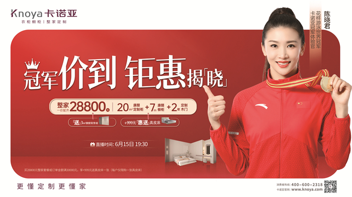 2023年6月15日,“618年中鉅惠|總部千萬(wàn)補(bǔ)貼計(jì)劃,定整家+999元惠送真皮床”618狂歡大促還在火熱進(jìn)行之際,卡諾亞將攜手花樣游泳世界冠軍陳曉君,重磅開(kāi)啟“冠軍價(jià)到,鉅惠揭「曉」”超級(jí)直播活動(dòng),花樣游泳世界冠軍陳曉君攜花樣寵粉福利空降直播間,帶大家進(jìn)階高顏高品整家家居生活。